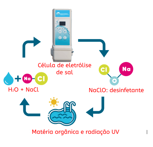 Este sal é então convertido em cloro pela célula de eletrólise. Depois que o cloro reage com algas, bactérias, etc., o cloro é convertido novamente em sal. Também deve ser ligada uma terra e é necessário escolher entre equipamentos “baixo sal” ou “alto sal” com respetivamente 2 ou 4 g/litro de sal (NaCl) dissolvido na água da piscina.