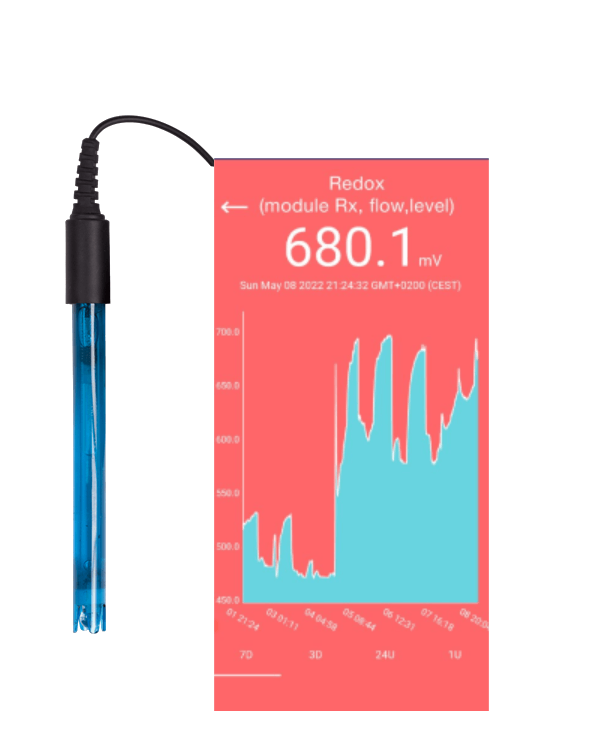 O cloro é medido com uma sonda Redox para eletrólise de sal. Em geral, um Redox de 700mV corresponde a 1 ppm de cloro. O sensor redox é coberto com uma camada protetora de ouro.