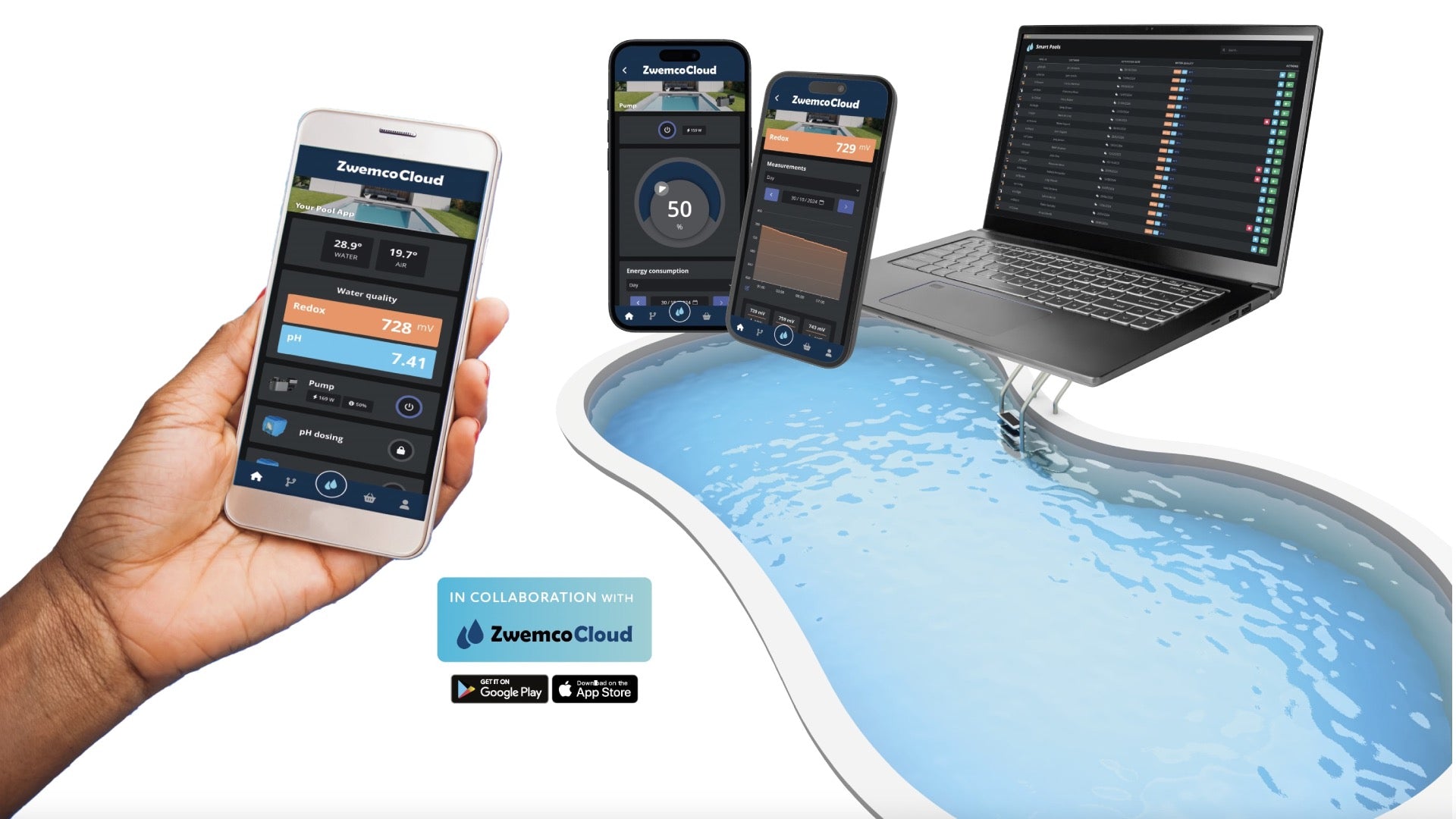 O aplicativo se torna o ponto central do controle da sua piscina. Você pode ver em um gráfico a rapidez com que a piscina foi aquecida pelo aquecimento solar, quão bem o pH permanece sob controle e você receberá uma mensagem de alarme porque o recipiente de cloro está vazio....