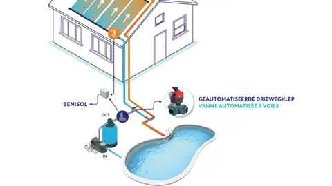 "calefacción solar". Cuando está nublado, el grifo gira hacia la piscina. El grifo