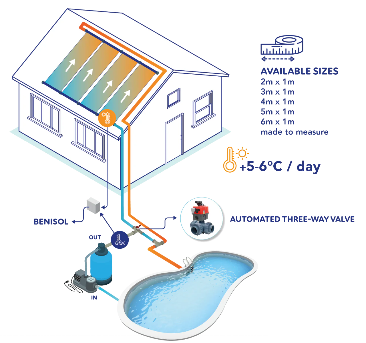 No es necesario realizar ninguna instalación eléctrica. Las sondas de temperatura miden la temperatura del agua de la piscina y del techo a pleno sol. En cuanto la temperatura del techo es 4 grados (ajustable) superior a la del agua de la piscina, el grifo pasa a la posición "calefacción solar"). En caso de lluvia, sombra, . el grifo vuelve a la posición "piscina" para evitar que el agua de la piscina se enfríe.